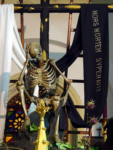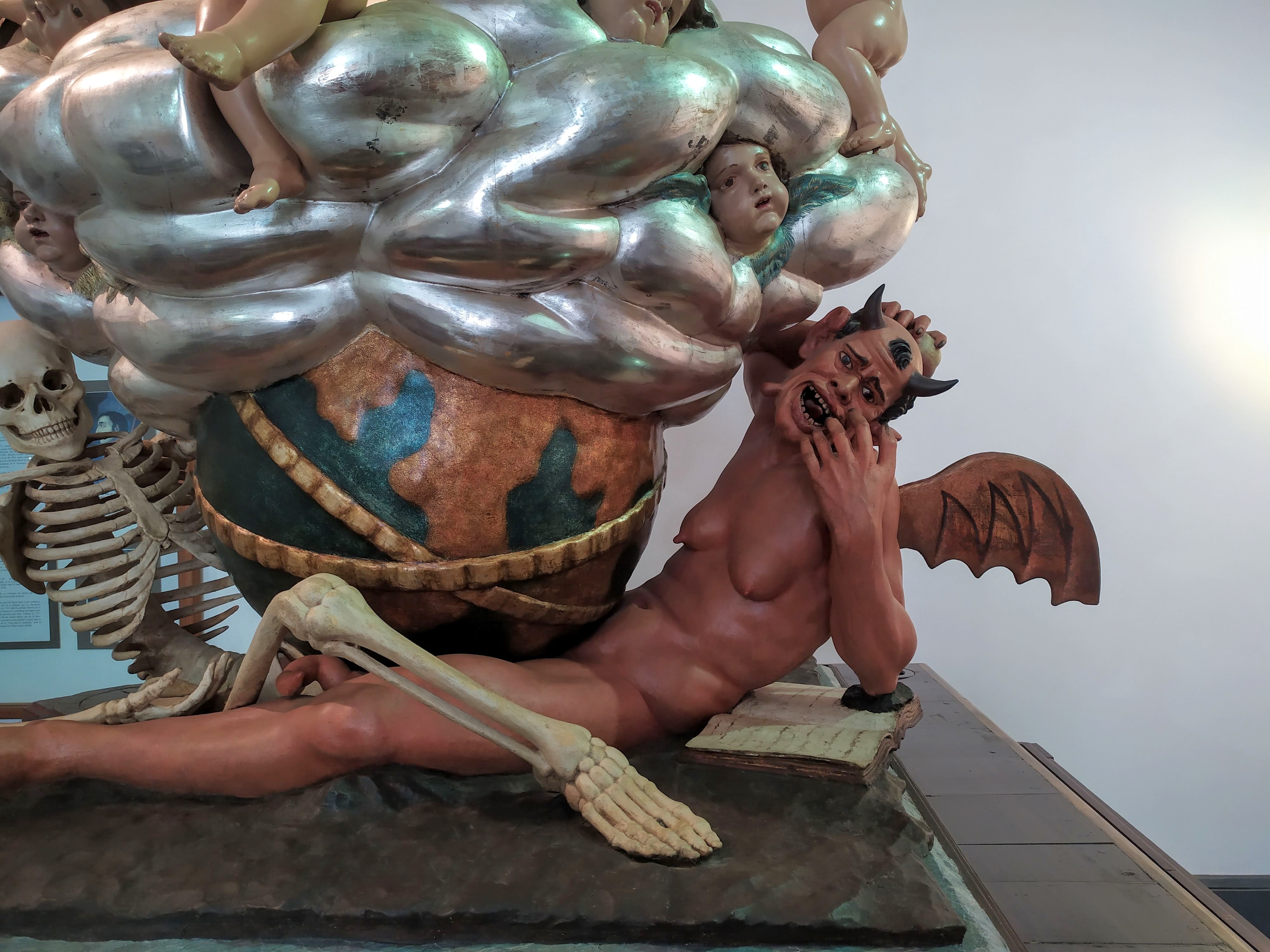 Sin embargo, lo original de la escultura de De Bussy es la combinación de todos los símbolos: la Cruz- resurrección cristina sobre el mundo, el pecado, la carne, el sexo, la manzana del génesis en la mano de la diablesa, y la muerte – tiempo.