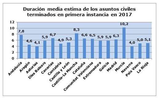 Pese a las nuevas instalaciones y la implantación del sistema con la nueva Oficina Judicial, llama la atención la terrible lentitud en la resolución de asuntos. Conforme a los datos del Consejo General del Poder Judicial en 2017, Murcia fue la tercera comunidad en cuanto a tasas de retraso judicial en resolución de pleitos (las más altas (peor situación) se han dado en Castilla-La Mancha (0,35); La Rioja (0,33) y Murcia (0,27), y la primera en duración media de los asuntos en 1º instancia civil, unido a una altísima tasa de litigiosidad (una litigiosidad superior a la nacional en Canarias (165), Andalucía (145), Illes Baleares (139), Asturias (129), Cantabria (130) y Murcia (128) ) con un bajo ratio de jueces llevando cada uno de los de la Región unos 1.271 asuntos / año, cifra superior a la media nacional.