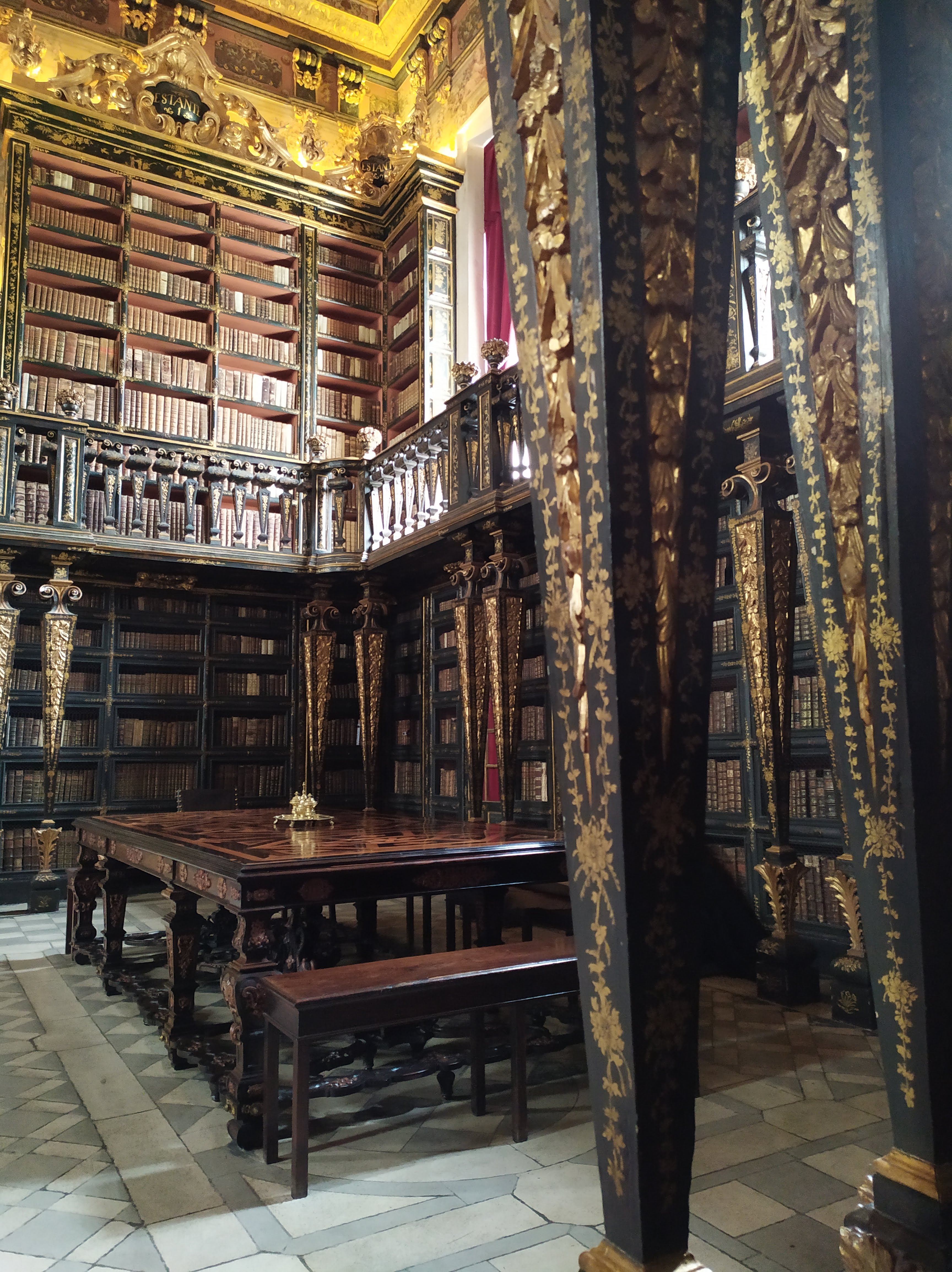 La joya de la Universidad de Coimbra sin duda es la Biblioteca Joanina construida hacia 1717 por encargo del rey João V de ahí su nombre. Es de estilo rococó y cuenta con una importante colección de libros únicos del Siglo XVI, XVII, XVIII cercanos a los 60.000 volúmenes y para su conservación la biblioteca debe mantenerse a 18 grados contando con la inestimable ayuda de una colonia de murciélagos que habitan en ella y cazan los insectos que podrían perjudicar a las colecciones.