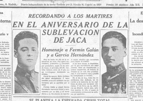 El 12 de diciembre de 1930 los capitanes Fermín Galán y Ángel García Hernández se sublevaron en Jaca (Huesca) mediante un golpe militar cuya intención era derrocar al Gobierno y la monarquía del rey Alfonso XIII, estableciendo la II República española.