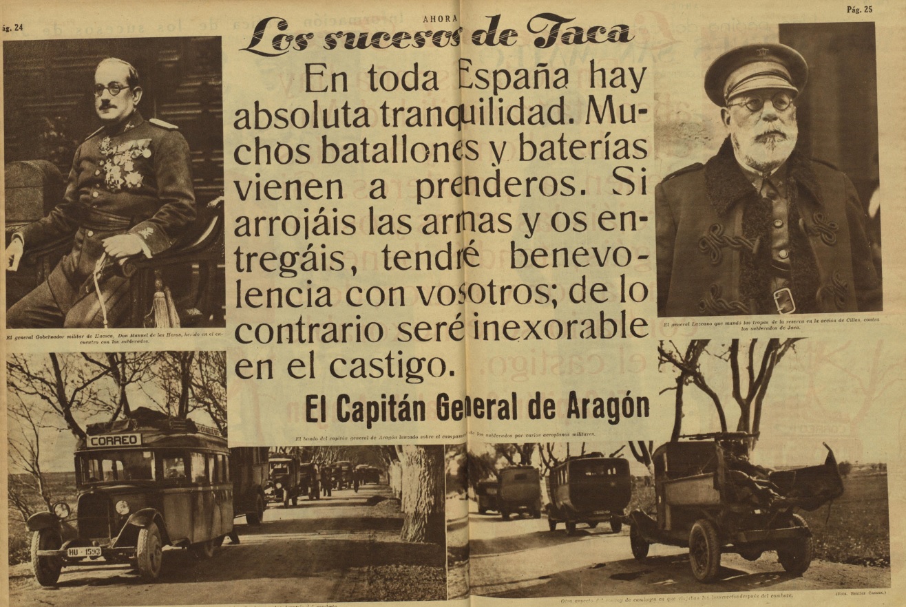 Quizás, precipitadamente o no coordinados con Madrid, los capitanes Galán y García toman Jaca y proclaman la República, pero la rebelión es sofocada por las tropas leales a Berenguer, son arrestadas más de 500 personas y sus responsables son juzgados y condenados a muerte en un Consejo de Guerra sumarísimo que el día 14 de diciembre ordena fusilar a Galán y García.