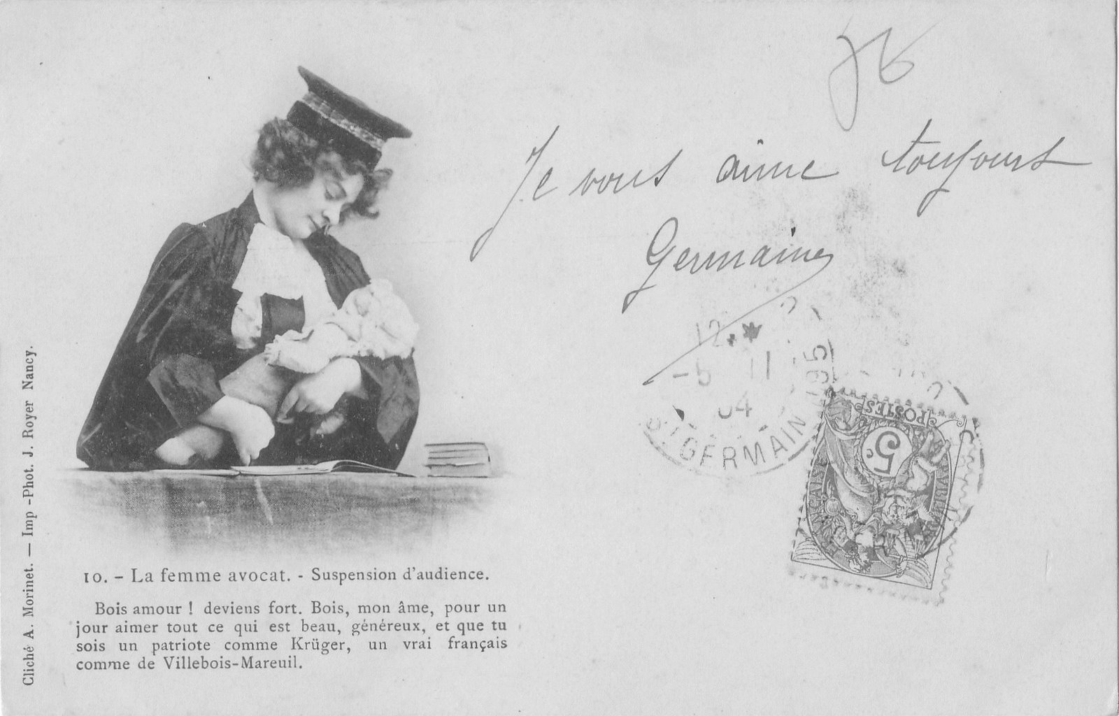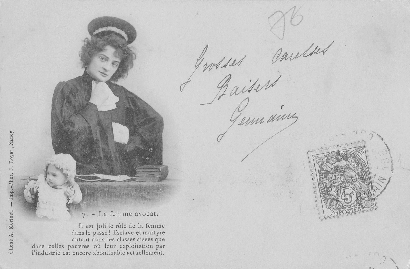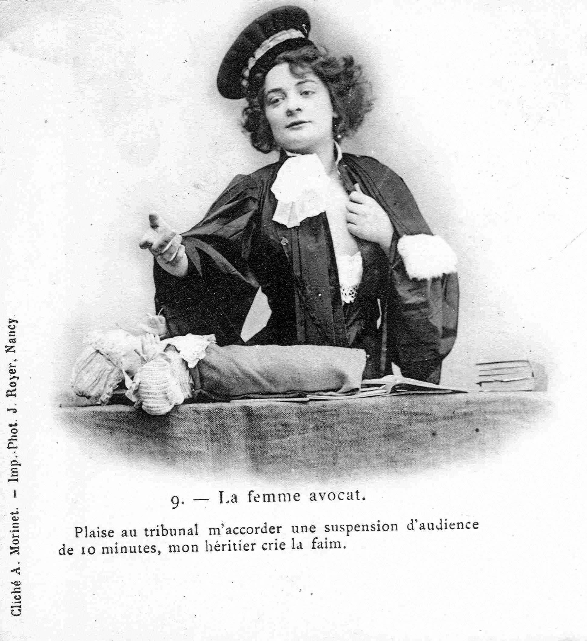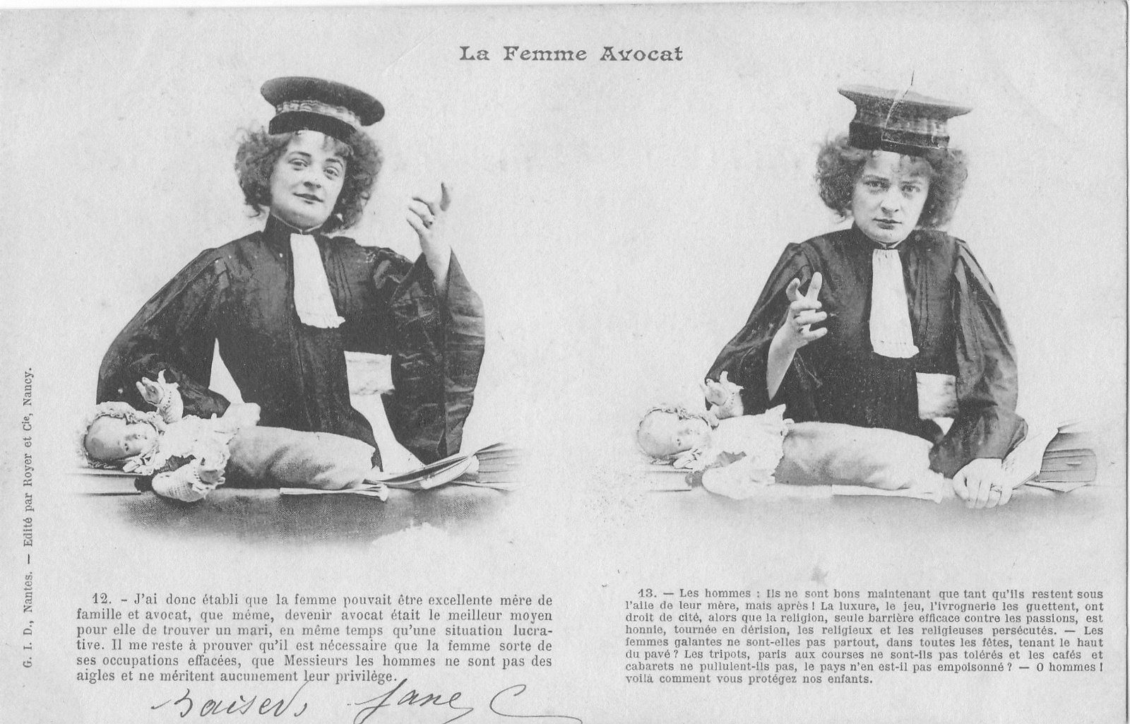 Aunque, en términos generales, la llegada de la mujer a la abogacía no fue bien recibida y no faltaron críticas y burlas. Incluso, se realizaron hacia 1901 en Francia cartas postales caricaturizando a las mujeres mientras abogaban en el tribunal y cuidan a bebés.