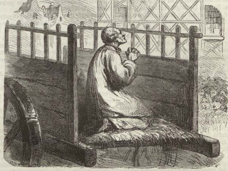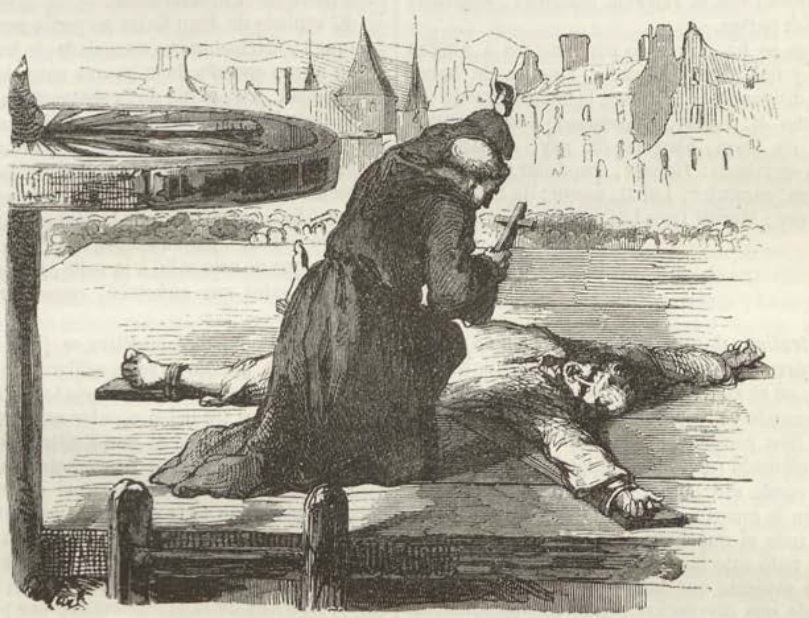 • 4º) hecho esto, el mismo verdugo le llevará y pondrá sobre una rueda, echado boca arriba, para que viva allí padeciendo y arrepintiéndose de sus susodichos crímenes y maldades y para que sirva de ejemplo e infunda terror a los malvados todo el tiempo que plazca al Señor concederle vida