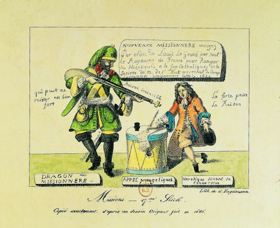 Pero los tiempos cambian, con ellos los reyes y sus políticas. El rey Luis XIV, el Rey Sol, el prototipo de monarca absoluto, consideraba una ventaja unificar el Estado bajo una única religión, así que decidió implantar el catolicismo en todo el territorio francés, haciendo suyo el famoso lema: «Una fe, una ley, un rey» (une foi, une loi, un roi). Para este fin, el monarca comenzó usando el sistema de la dragonada: un simple y sencillo método de extorsión. Los dragones eran militares-misioneros del rey que debían ser alojados y alimentados en las casas de los protestantes. Si no era suficiente esta carga, los dragones podían vejarlos hasta conseguir la adjuración de la confesión protestante. Finalmente, el 18 de octubre de 1685 el monarca decidió dejar la extorsión y comenzar la persecución. Mediante el edicto de Fontainebleau se decretó como única religión legal al catolicismo en todo el territorio francés revocando el edicto de Nantes. Aunque el edicto de 1685 garantizaba la libertad de conciencia, fue el comienzo del exilio para muchos de los protestantes. Se instauró la pena capital contra los pastores sorprendidos ejerciendo. Estaba permitido no ser católico pero con consecuencias muy negativas. Luis XV (1715-1774) continuará con la política absolutista y procatólica de su padre.
