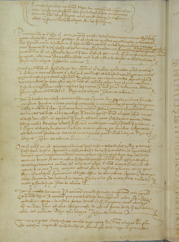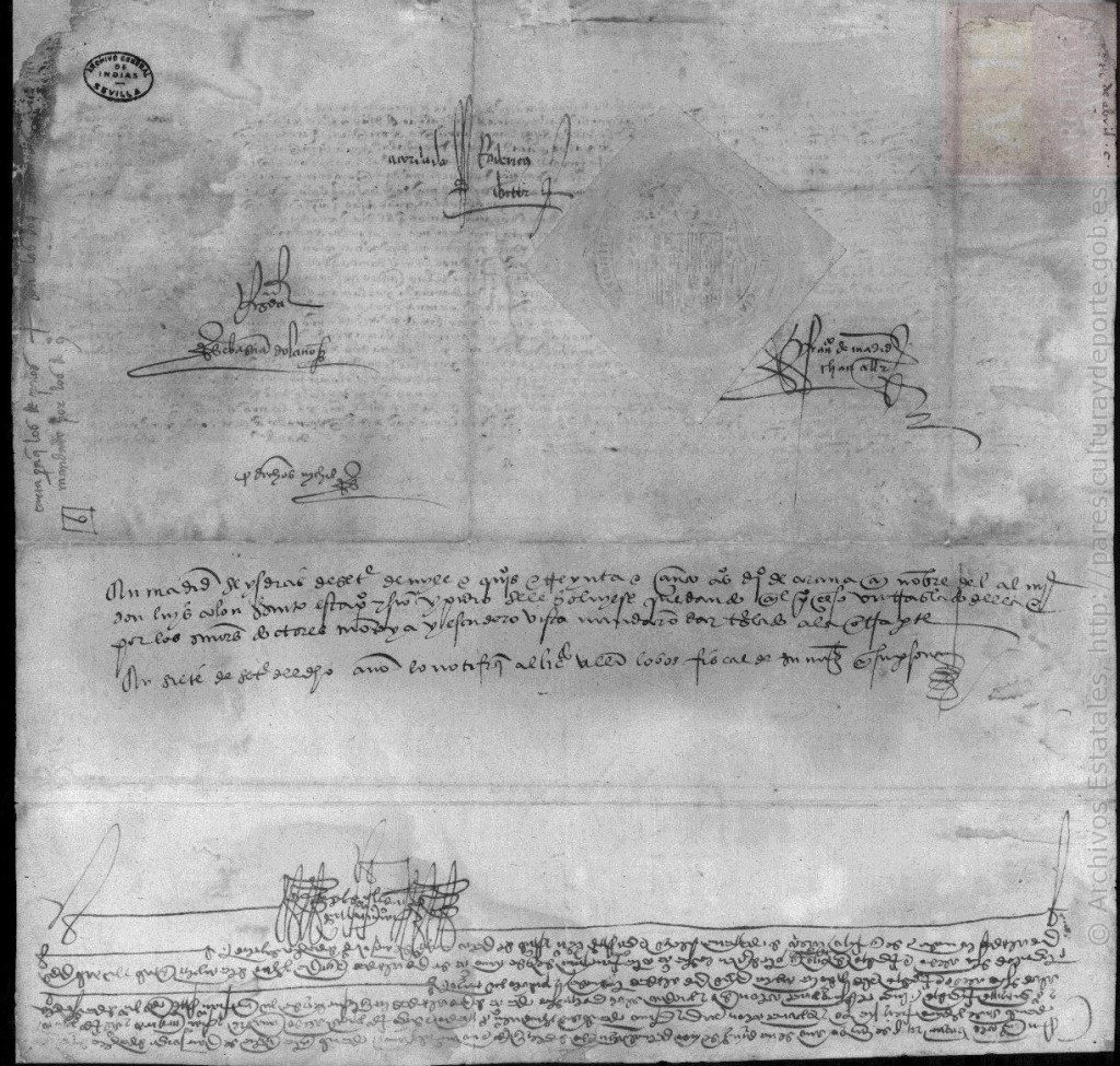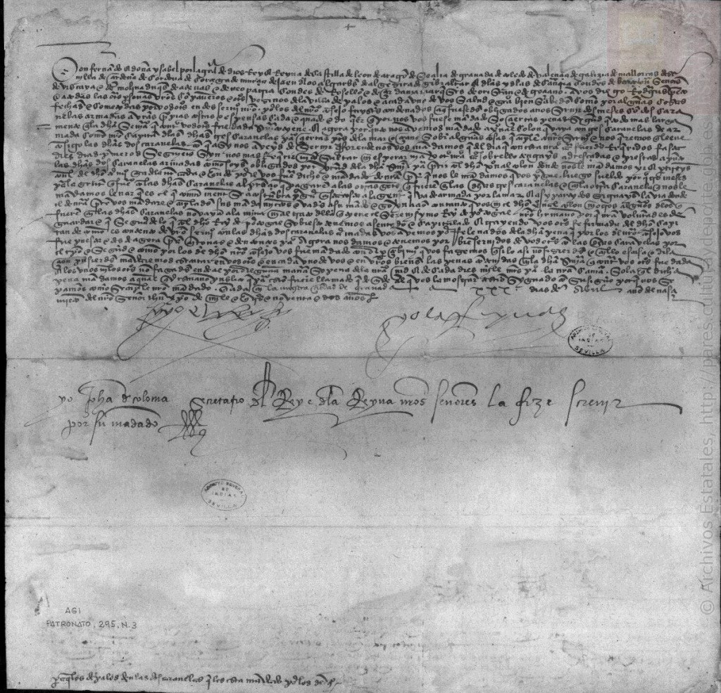 Por ende Nos vos mandamos, que del día que con esta nuestra carta fuéredes requeridos fasta diez días primeros seguientes, syn nos más requerir ni consultar ni esperar ni aver otra nuestra carta sobre ello, tengais aderesçadas e prestas a punto las dichas dos carabelas armadas como soys obligados por vertud de la dicha sentencia, para partir con el dicho Christóval Colón donde nos le mandamos yr, e partireys con él del dicho término en adelante, cada e quando por él vos fuere dicho e mandado de nuestra parte, que nos le mandamos que vos pague luego sueldo por quatro meses por la gente que fuere con las dichas carabelas al prescio que pagare a las otras gentes que fueren en las dichas dos carabelas e en la otra carabela que nos le mandamos levar, que es el que comúnmente se acostumbra pagar en esta costa a la gente que va de armada por la mar, e asy partidos sigays la vía donde él de nuestra parte vos mandare, e cunplades sus mandamientos e vades a su mando e gobernaçión, con tanto que vos ni el dicho Christóval Colón ni otros algunos de los que fueren en las dichas carabelas no vayan a la Mina ni al trato de los que tiene el serenisimo Rey de Portugal nuestro hermano, porque nuestra voluntad es de guardar e se guarde lo que con el dicho Rey de Portogal sobresto tenemos asentado e capitulado. E trayendo vosotros fe firmada del dicho capitán de como es contento de vuestro servicio con las dichas dos carabelas armadas vos avemos por relevados de la dicha pena que por los del nuestro Consejo vos fue puesta, e desde agora para entonces e dentonces para agora nos damos e tenemos por vien servidos de vosotros con las dichas carabelas por el tiempo e segund e como por los del nuestro Consejo vos fue mandado, con apercibimiento que vos fazemos que si loasí no fiziéredes o en ello escusa o dilación pusiéredes mandaremos esecutar en vosotros e en cada uno de vos e en vuestros bienes las penas contenidas en la dicha sentencia que contra vosotros fue dada, e los unos ni los otros no fagades ende al por alguna manera so pena de la nuestra merced e de cada diez mill maravedís para la nuestra cámara, so la qual dicha pena mandamos a qualquier escrivano público, que para esto fuere llamado, que de ende al que vos la mostrare testimonio signado, porque nos sepamos como se cunple nuestro mandado. Dada en la nuestra ciudad de Granada a treynta días de abrill año del nascimiento de nuestro señor Ihesu Christo de mill e quatrozientos e nobenta e dos años. / YO EL REY. YO LA REINA / Yo, Ihoan de Coloma, secretarjo del rey e de la reyna, nuestros señores, la fize escribir por su mandado. Acordada, Rodericus doctor. Registrada Sebastián Dolano, Francisco de Madrid chanciller.
