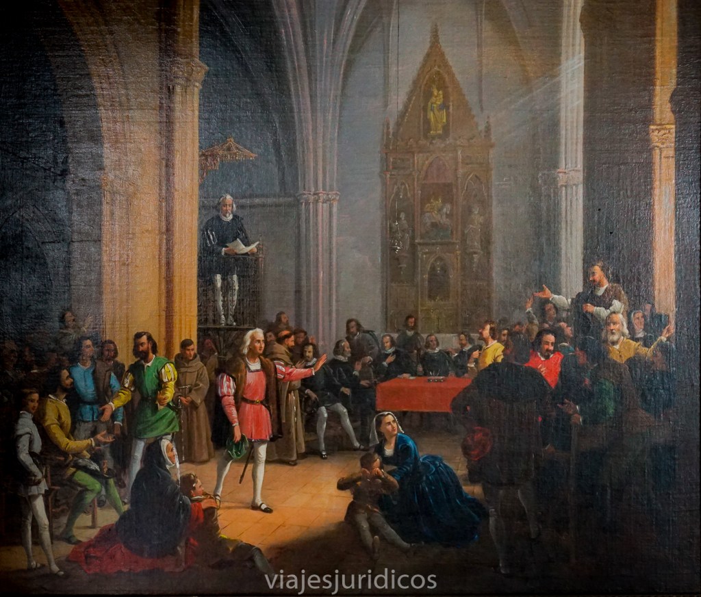 Como elementos jurídicos de aquellos hechos destaca el acuerdo de Cristóbal Colón con los Reyes Católicos plasmado en las Capitulaciones de Santa Fe firmadas el 17 de abril de 1492 en Santa Fe, Granada, donde se acordaban títulos y diezmos a Colón por las futuras tierras descubiertas para la Corona, pero a estas Capitulaciones se le unen otras disposiciones para acompañar la efectividad del primer viaje planteado por Colón y, principalmente, la disposición real de 30 de abril de 1492, relativa a los barcos, a la propia tripulación y provisiones necesarias para el mismo.