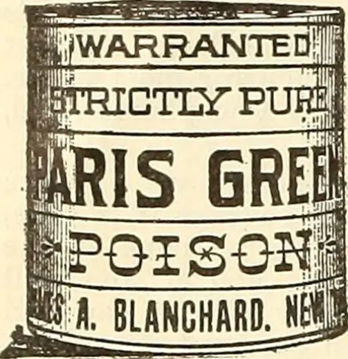 El verde de París en esta época comienza a ser aplicado en la agricultura como pesticida, así hacia 1900, su uso era tal que el estado de California aprueba la primera ley estatal sobre pesticidas de Estados Unidos en 1901; pretendía prevenir el fraude en la venta del Verde de París. El Verde París era enormemente letal para los mamíferos y, finalmente, tuvo que ser prohibido.
