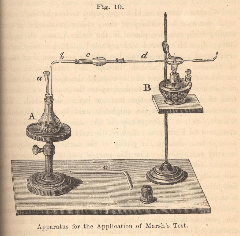 Así, en 1836 inventó un aparato capaz de detectar el rastro dejado por el arsénico y su cantidad: el test Marsh. Mediante la reacción de elementos químicos como zinc y ácido sulfúrico se conseguía obtener restos de arsénico y medir su cantidad.