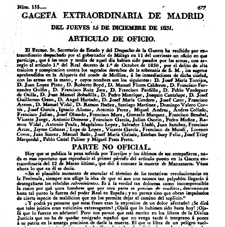 Pues no: ya es llegado el momento y debéis aprovecharlo con valor. Arrancad las armas de las manos de esos verdugos nacidos por desgracia en España, y que ni aprecian su país, sus familias, ni su honor. Al ver a los libres dar el grito que va a resonar por toda la España marchad con energía, y en pocas horas respiraremos libres. El momento se acerca, ya llega la hora, nuestra conducta con nuestros enemigos será la que ellos observen con nosotros. No queremos venganzas, los que se nos unan conservarán sus empleos y serán atendidos y ascendidos, con los que se nos oponga; obraremos como ellos obraren. Ciudadanos patriotas; virtuosos Eclesiásticos; Magistrados ilustrados; Militares españoles; Soldados de la libertad; Artesanos honrados; Hijas de la patria; a todos os invocamos: ayudadnos a salvar la patria, o a perecer por ella en su defensa. Está visto; en los Borbones nada hay que esperar jamás sino perjurios, vicios, crímenes, desgracias, opresión, sangre, despotismo y ruinas. El Rey nos ha engañado hartas veces; hagámosle ver que los Españoles tenemos aún valor, resolución, vergüenza, y que si sabemos respetar al hombre Rey, sabemos también a imitación de nuestros abuelos darle un puntapié si se sobrepone a las leyes, y gobernarnos como queramos. Libertemos a España de tantos tributos y contribuciones: tenga honor el pabellón: vivan todas las clases: respiremos libertad. —20 de mayo de 1831» Causas, t. V, p. 277. Un «Manifiesto a la Nación», impreso, de Flores Calderón y Torrijos, en AHN. El ms. se encuentra en la Biblioteca Municipal de Madrid.