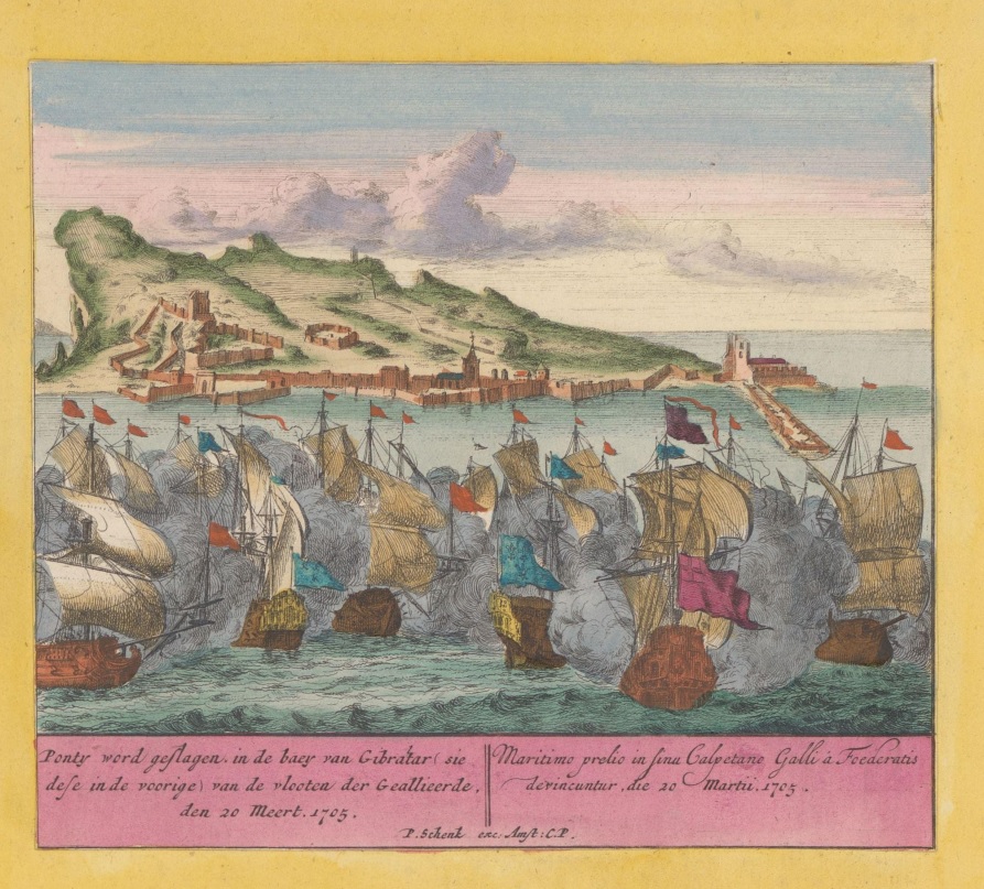 Será en este contexto cuando en 1704 las naves inglesas y holandesas, aliadas del Archiduque Carlos, aparecen frente a la ciudad de Gibraltar encontrándola, pese a su importancia geoestratégica, muy escasamente guarnecida con sólo unos 80 soldados al mando de Don Diego de Salinas, el último gobernador español del Peñón, quien capituló el 4 de agosto ante la potente armada anglo-holandesa. La ciudad se tomó en nombre del Archiduque Carlos, tal y como sucedió con otras ciudades españolas, pero al finalizar la Guerra mediante el Tratado de Utrecht que reconocía a Felipe V como rey de España, Gibraltar acabó siendo una colonia dentro de España. En palabras del escritor Arturo Pérez Reverte (2019): «Al final, la España borbónica y su aliada Francia ganaron la guerra; pero éramos ya tal piltrafa militar y diplomática que hasta los vencidos ganaron más que nosotros, y la victoria de Felipe V nos costó un huevo de la cara. Con la Paz de Utrecht, todos se beneficiaron menos el interesado. Francia mantuvo su influencia mundial, pero España perdió todas las posesiones europeas que le quedaban: Bélgica, Luxemburgo, Cerdeña, Nápoles y Milán; y de postre, Gibraltar y Menorca, retenidas por los ingleses como bases navales para su escuadra del Mediterráneo.» El artículo 10 del Tratado de Utrecht es el que nos habla de cesión de Gibraltar a la corona inglesa.