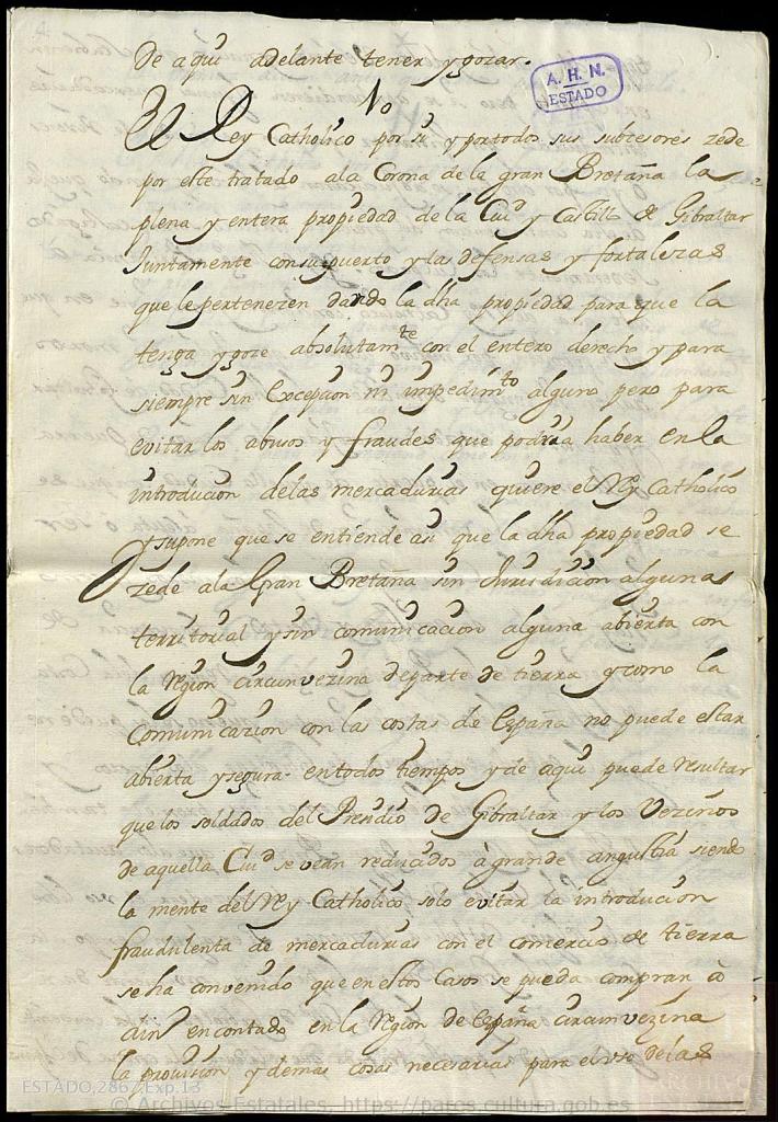 El Rey Católico, por sí y por sus herederos y sucesores, cede por este Tratado a la Corona de la Gran Bretaña la plena y entera propiedad de la ciudad y castillo de Gibraltar, juntamente con su puerto, defensas y fortalezas que le pertenecen, dando la dicha propiedad absolutamente para que la tenga y goce con entero derecho y para siempre, sin excepción ni impedimento alguno. Pero, para evitar cualquiera abusos y fraudes en la introducción de las mercaderías, quiere el Rey Católico, y supone que así se ha de entender, que la dicha propiedad se ceda a la Gran Bretaña sin jurisdicción alguna territorial y sin comunicación alguna abierta con el país circunvecino por parte de tierra. Y como la comunicación por mar con la costa de España no puede estar abierta y segura en todos los tiempos, y de aquí puede resultar que los soldados de la guarnición de Gibraltar y los vecinos de aquella ciudad se ven reducidos a grandes angustias, siendo la mente del Rey Católico sólo impedir, como queda dicho más arriba, la introducción fraudulenta de mercaderías por la vía de tierra, se ha acordado que en estos casos se pueda comprar a dinero de contado en tierra de España circunvencina la provisión y demás cosas necesarias para el uso de las tropas del presidio, de los vecinos u de las naves surtas en el puerto.